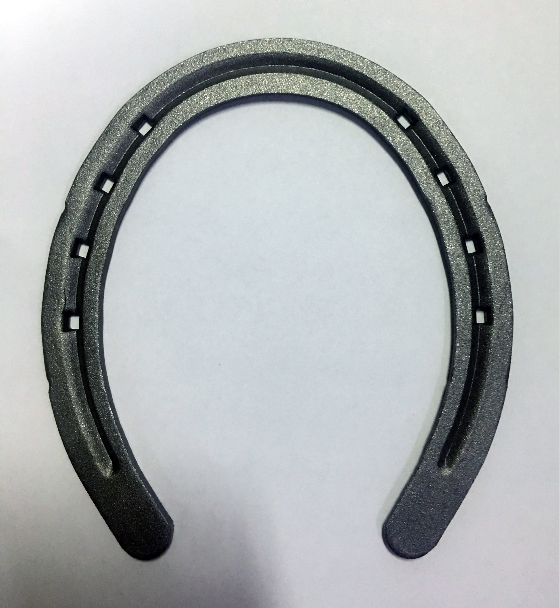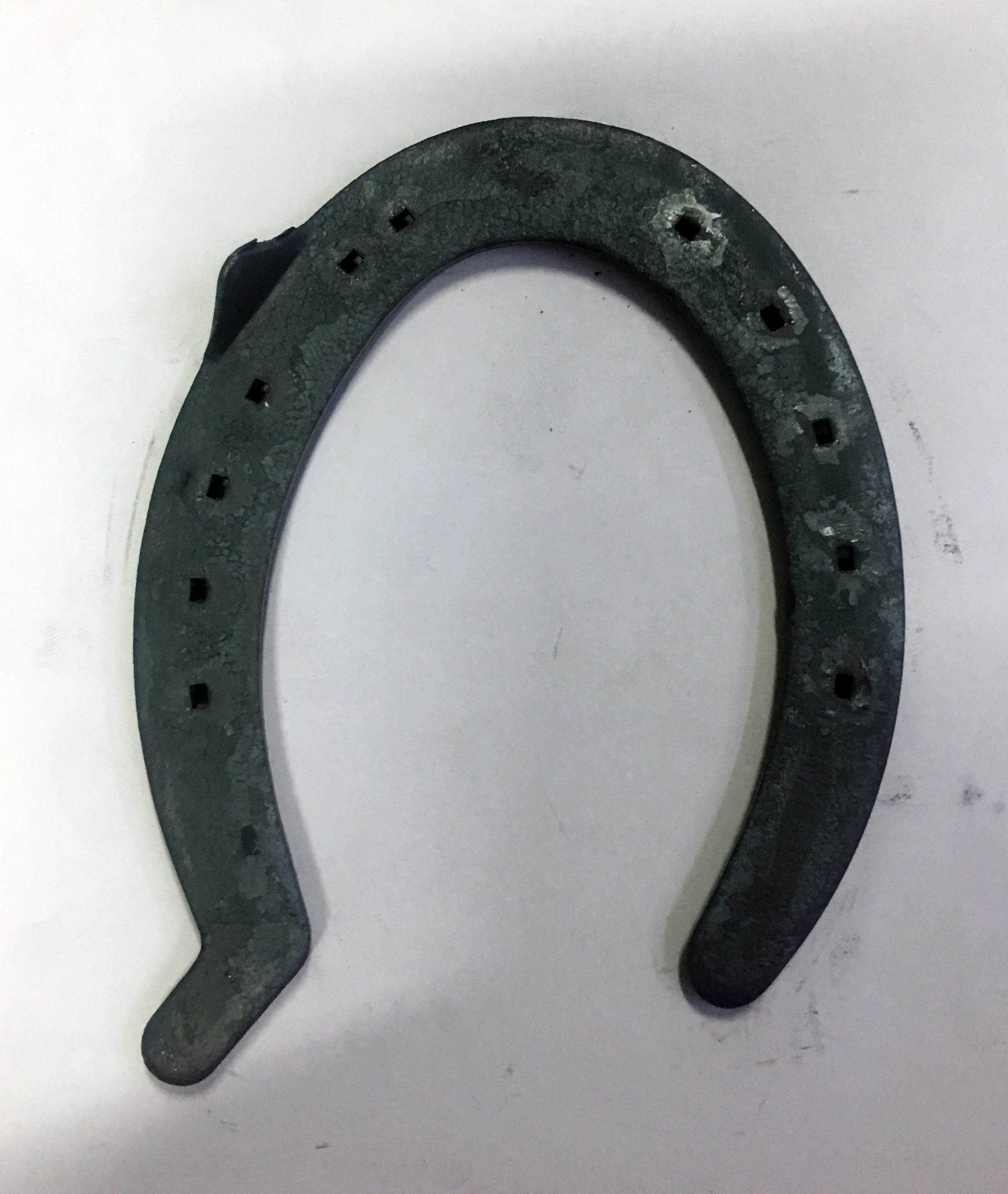 Ferro realizzato tramite stampaggio a caldo del metallo, materiale certificato di qualità superiore. Forma asimmetrica per seguire meglio la forma del piede posteriore. La punta e i talloni pieni favoriscono lo scivolamento e limitano l’eccessiva usura, la barbetta sulla branca esterna incrementa la tenuta del ferro sottoposto a forti sollecitazioni dovute all’andatura e fa sì che il ferro non si “giri” sotto il piede. Usato prevalentemente da Strada.